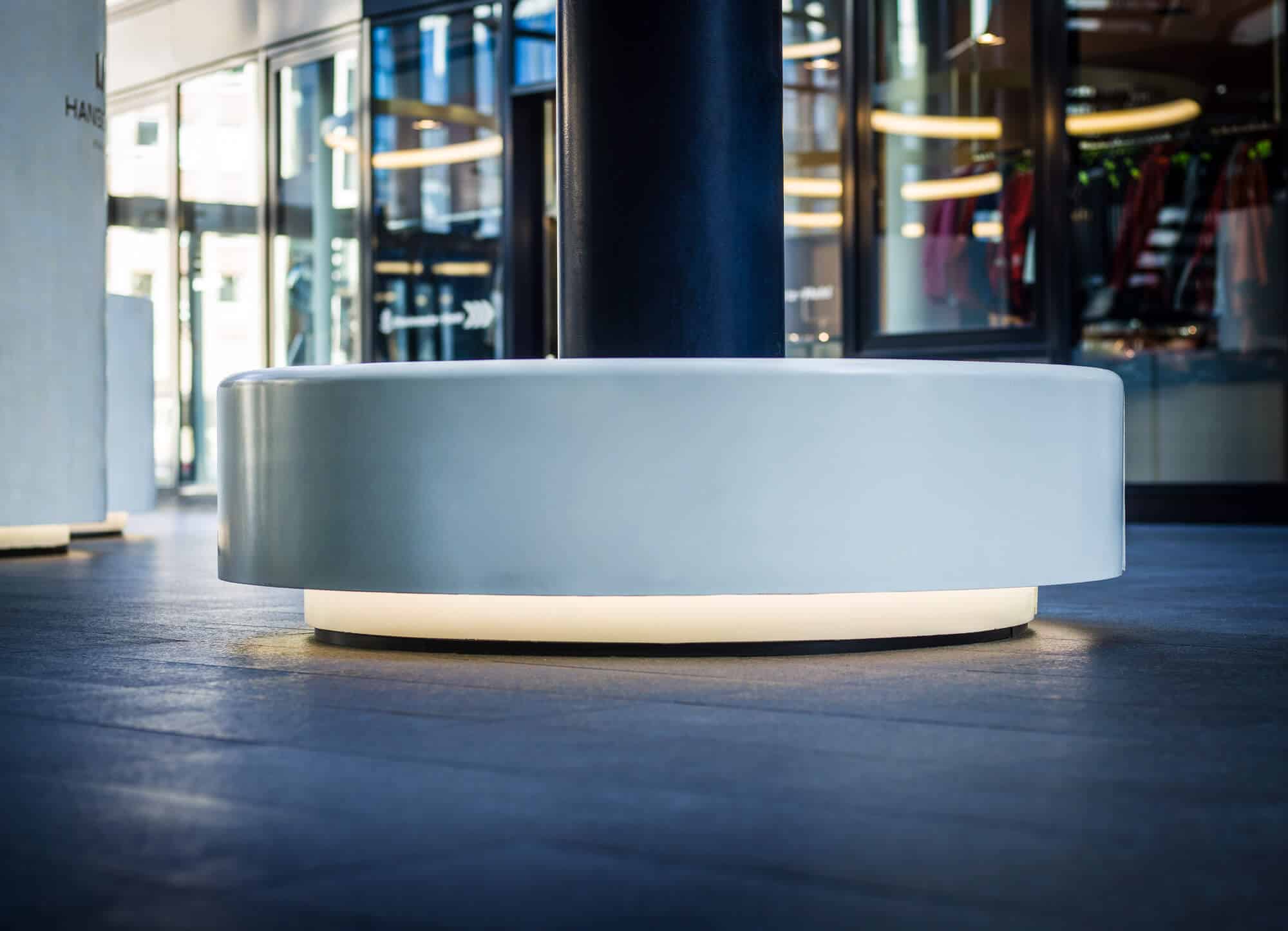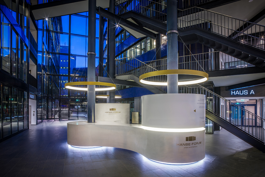 Just in time. Das Hanse Forum in Hamburg für den Foyer mit Beton Theke und Beton Briefkasten mit Sitzgelegenheiten und ein Betonstehtisch. Alle Elemente sind beheizt und beleuchtet.